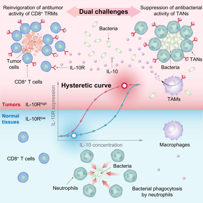 圖:IL-10R遲滯效應導致了腫瘤微環境內的免疫細胞IL-10R高表達特性,細菌利用這一特性,同時實現了其避免被中性粒細胞快速清除,并激活腫瘤內組織駐留記憶CD8+?T細胞高效殺傷癌細胞。