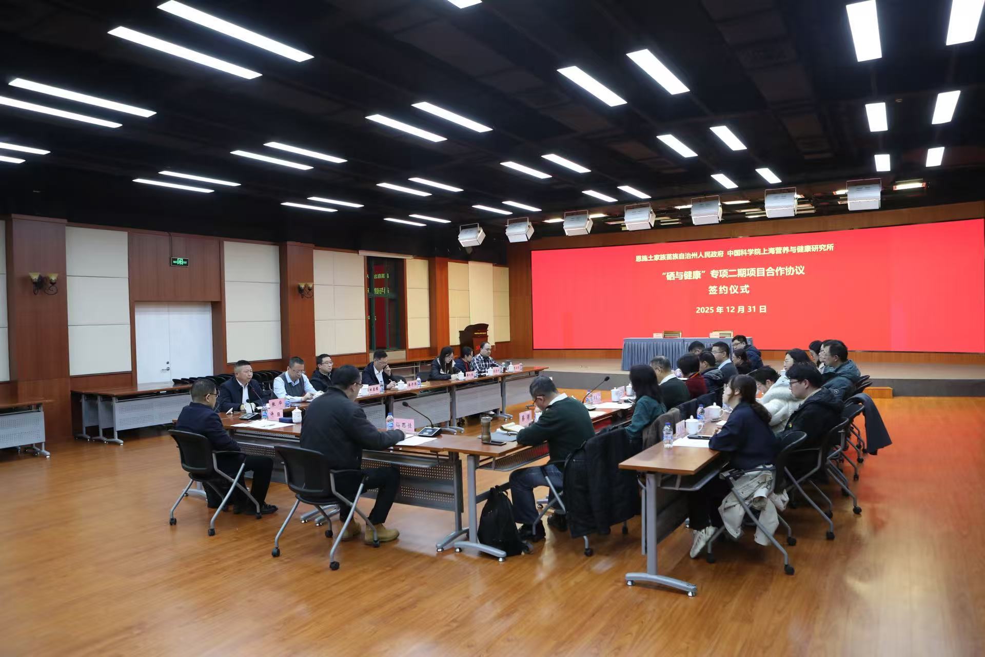 12月31日,恩施土家族苗族自治州人民政府與中國科學院上海營養與健康研究所簽訂“硒與健康”專項二期項目合作協議。恩施州人民政府副州長許強,營養與健康所所長汪思佳出席簽約儀式,并共同簽署合作協議。恩施州科學技術局局長張華,恩施州高新集團董事長胡銘,項目總顧問蔡澎研究員、項目負責人丁秋蓉研究員等項目組代表以及營養與健康所相關職能部門代表一同出席。會議由營養與健康所成果轉化與合作處處長裴旸主持。